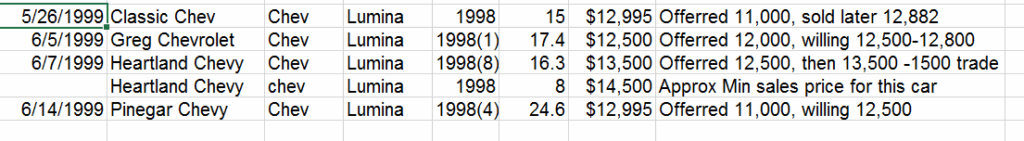 I looked at many used Lumina’s with 8,000 to 18,000 miles.    I made the following offers: